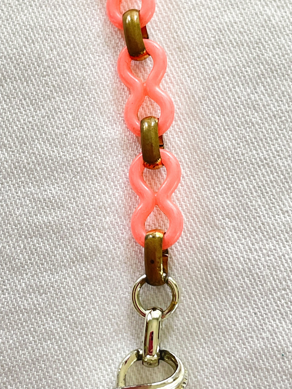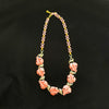 Peach Lucite leaves set in gold tone metal with brass fittings on the chain.