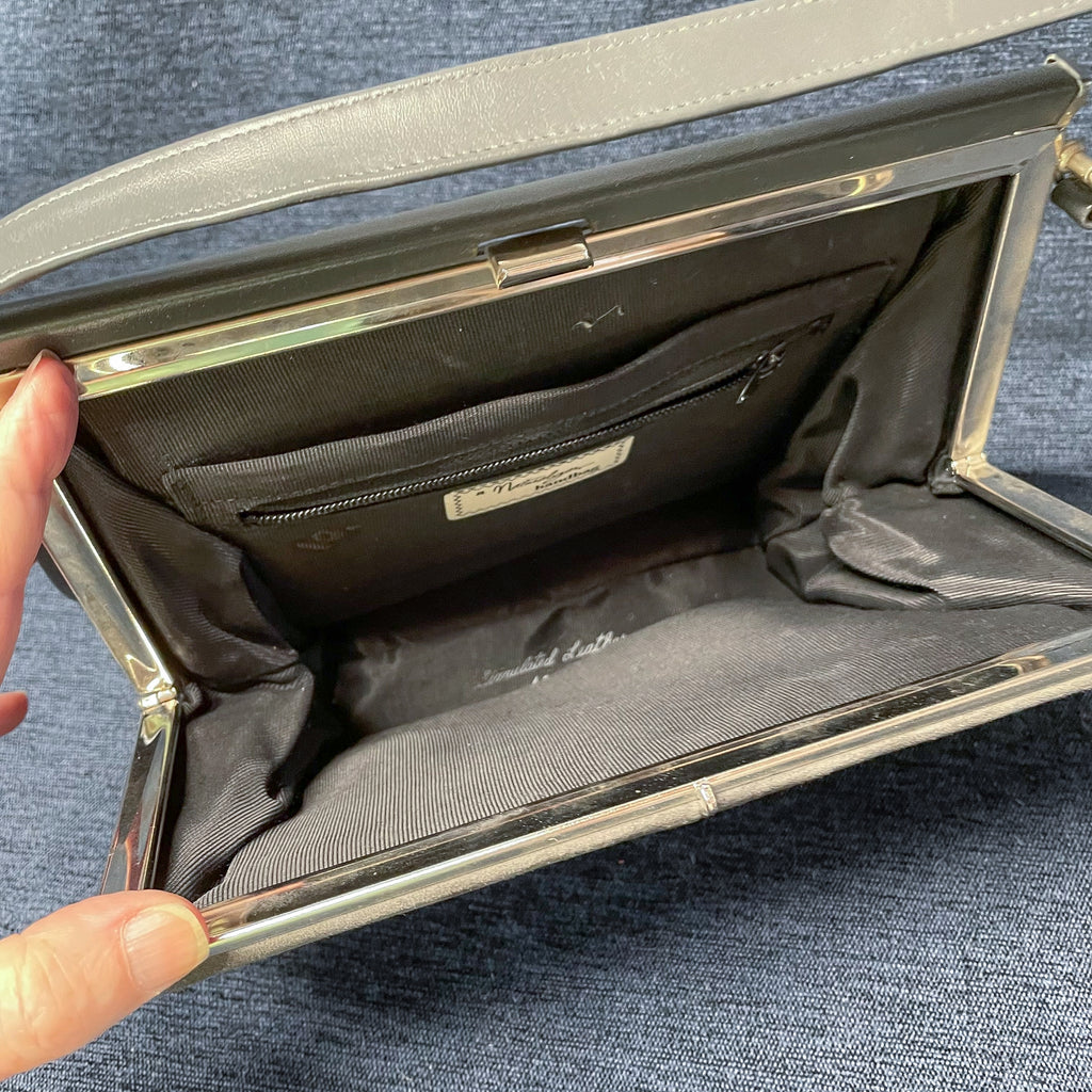 Fabric lined. 2 flat interior pockets, 1 with a zipper.