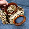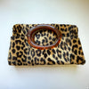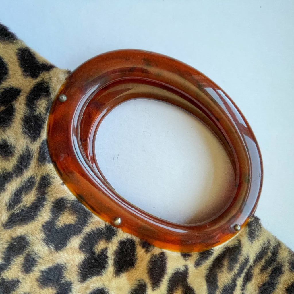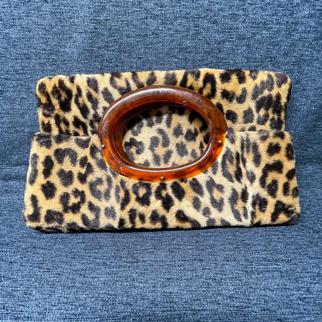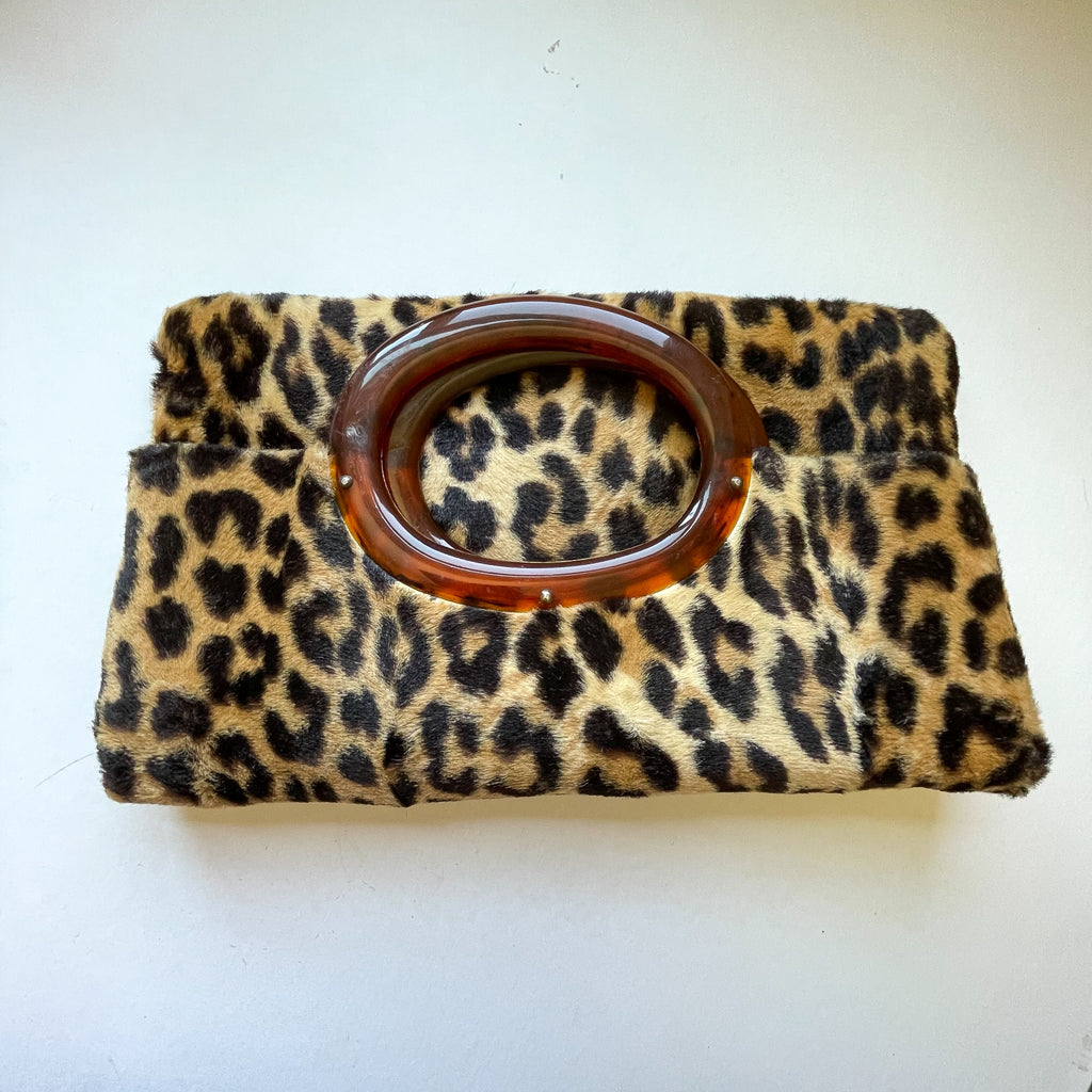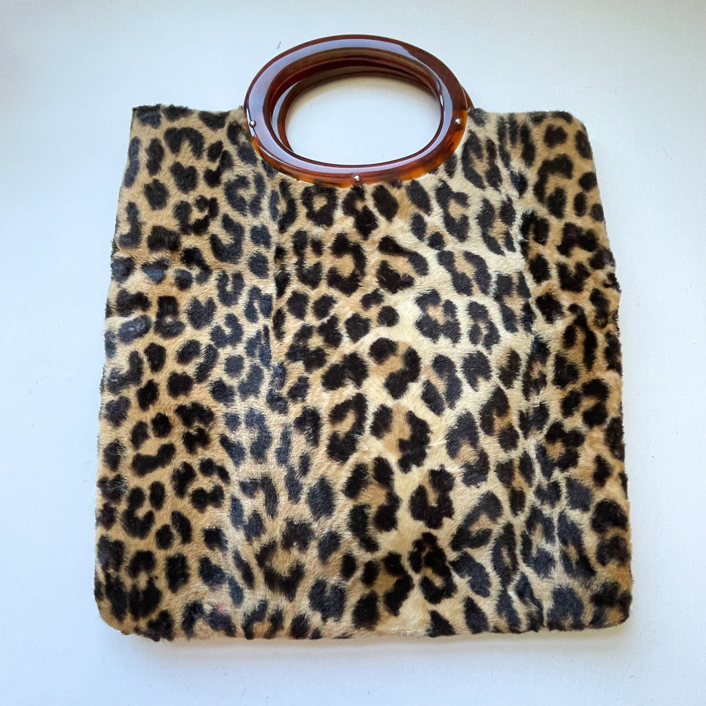 Vintage 60s faux fur fuzzy fabric leopard bag with top handles.