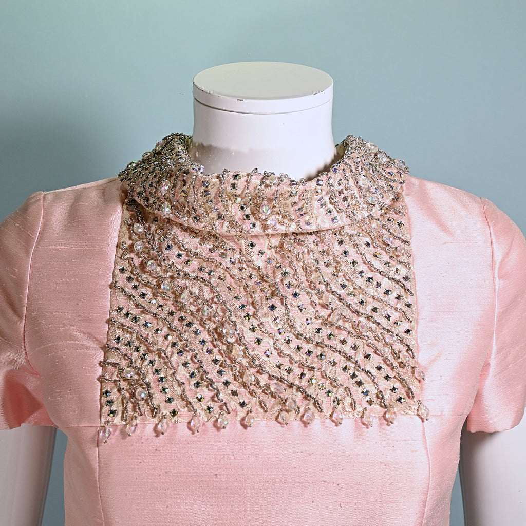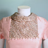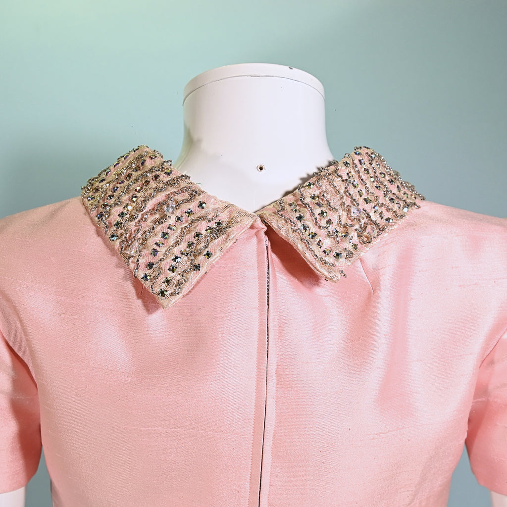 Lovely 60s A-line Mod bejeweled mini dress.Structured fit, short sleeves, concealed pockets.Mock rolled neckline, zipper up the back.Pretty 60s party dress. LABEL: Made expressly for Charles Sumner, Boston.