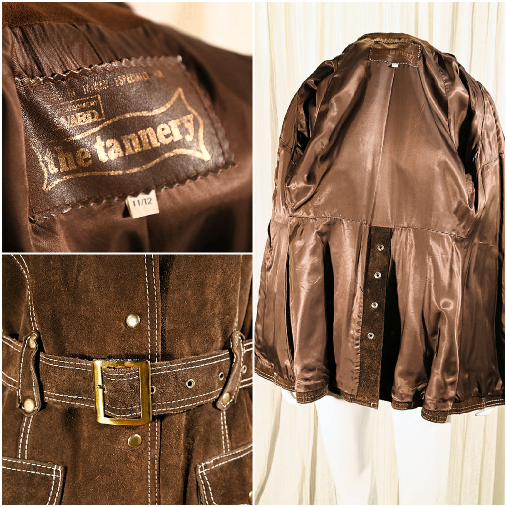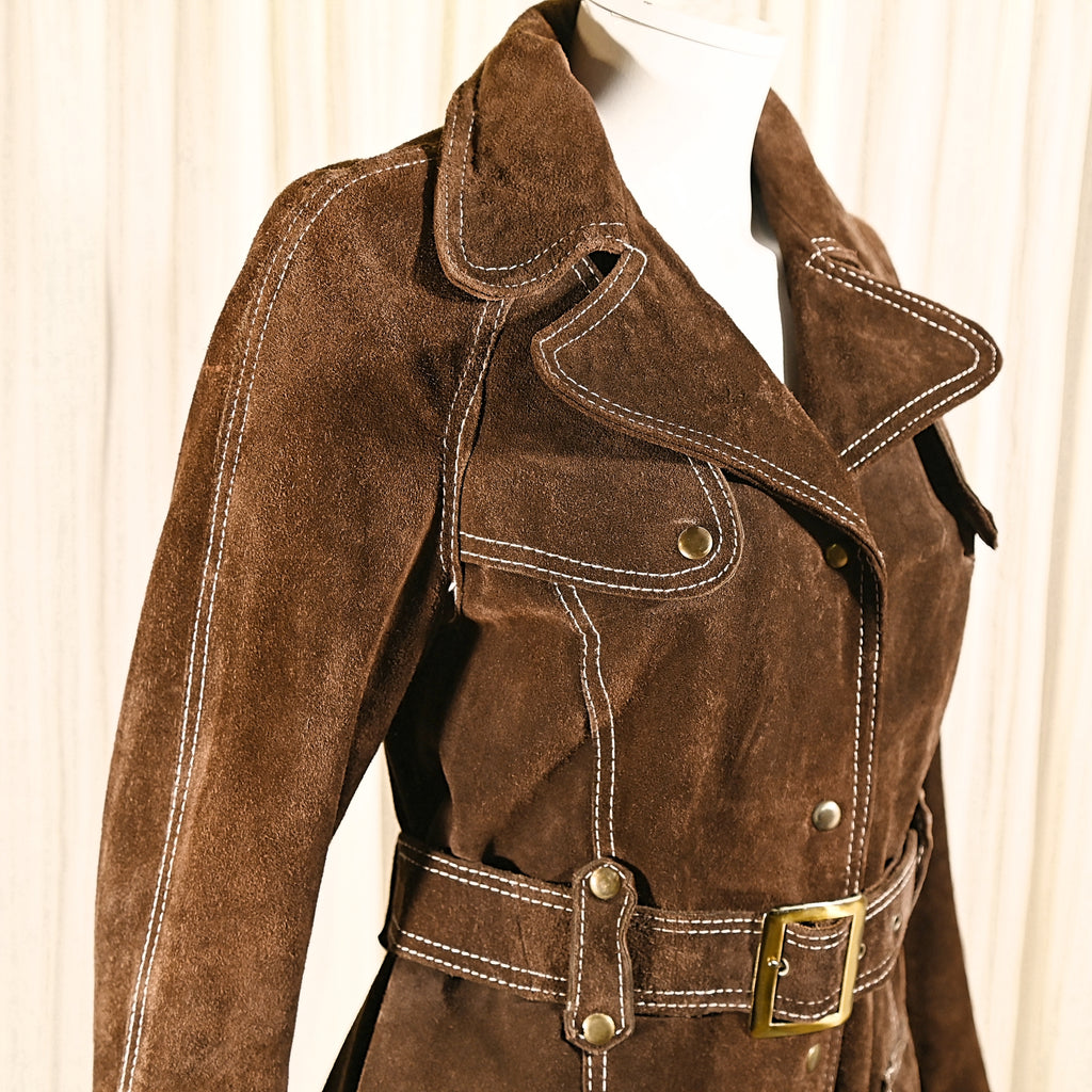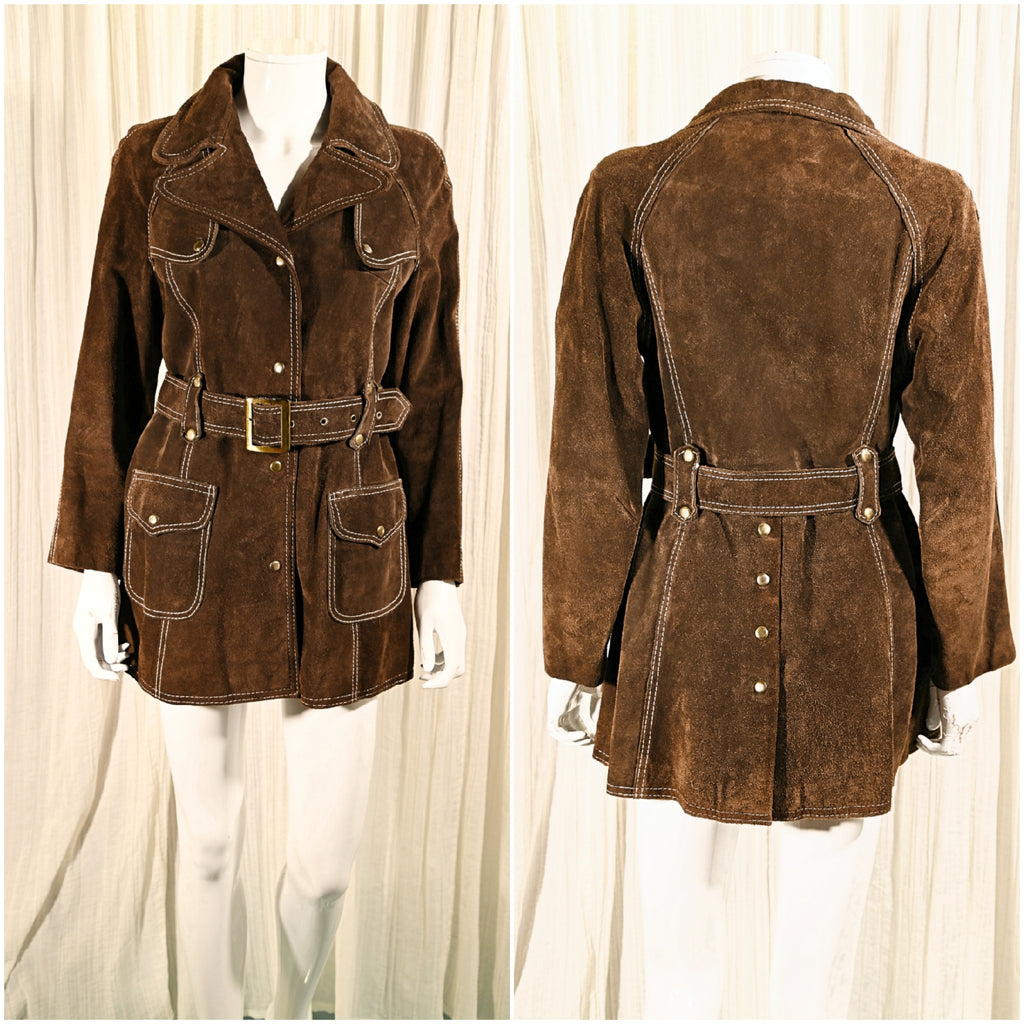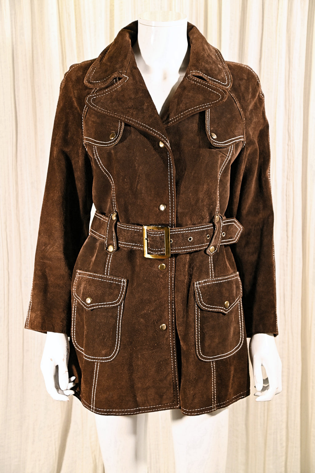 Dark brown suede jacket with large collar, patch pockets and matching belt.Brown sued is topstitched with white stitching. Snaps up the front, and on the back.Inset raglan sleeve.Fabric lined, belt with brass buckle.