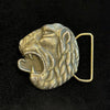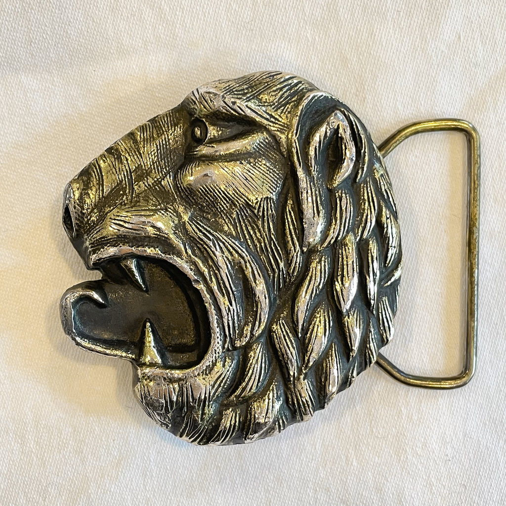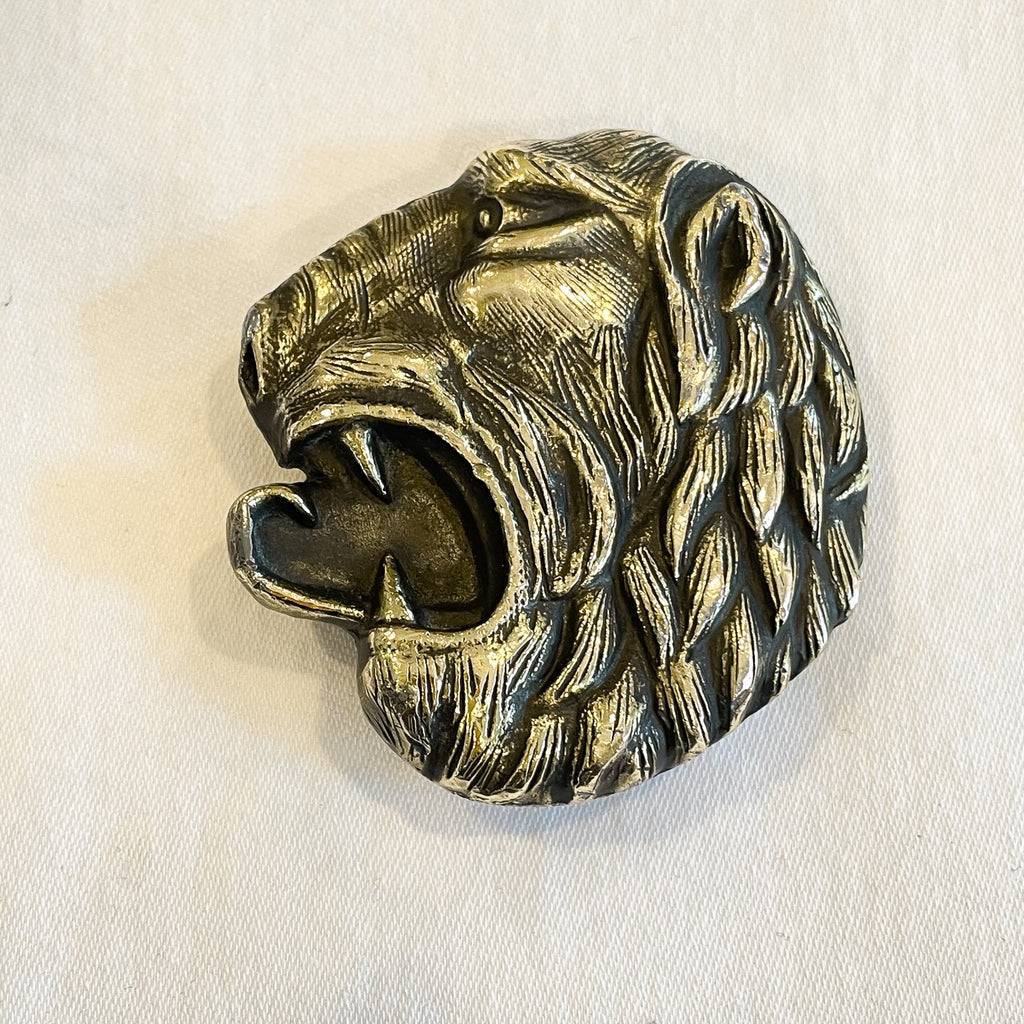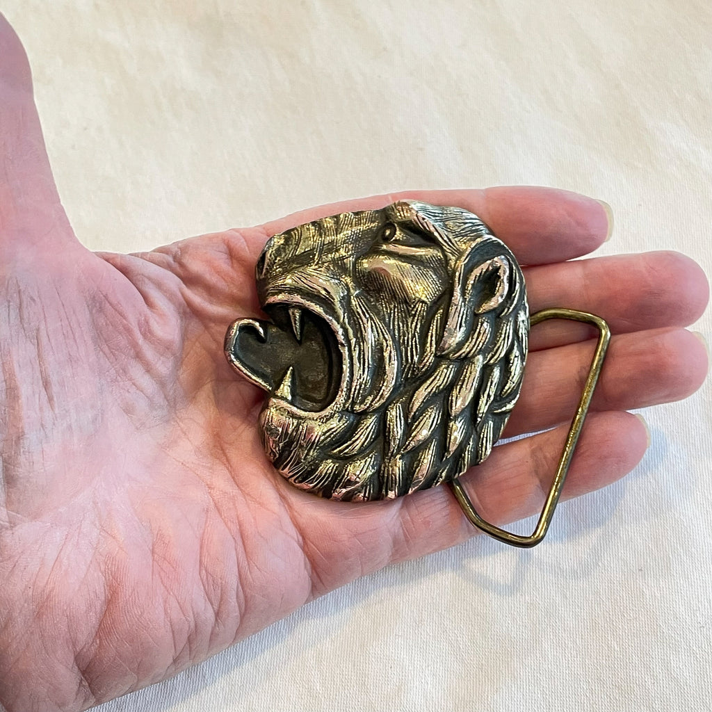 Vintage 70s brass lion belt buckle. Fierce roaring lion with mouth open.