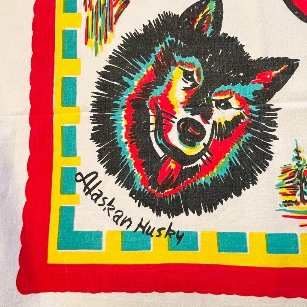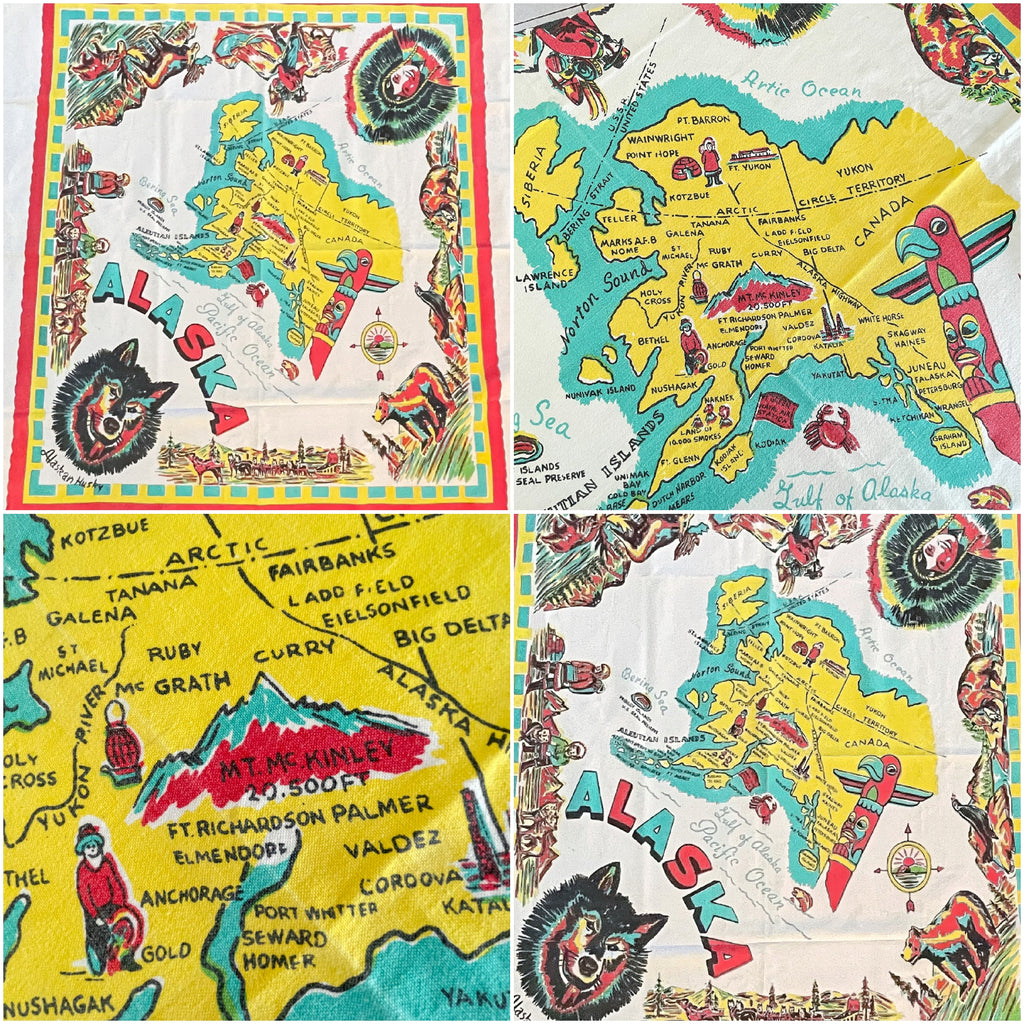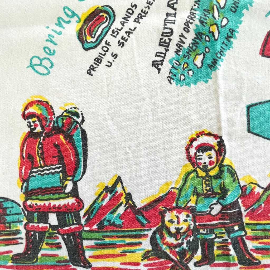 Vintage Alaska souvenir tablecloth with map including cities and interesting tourist sights.