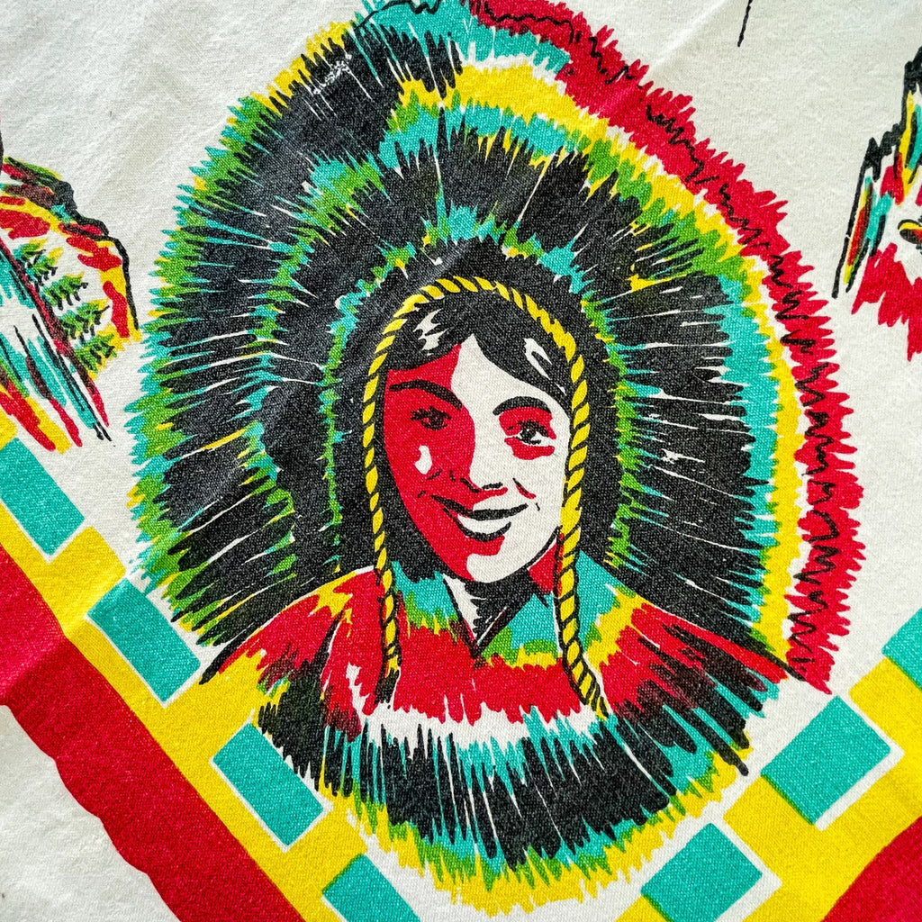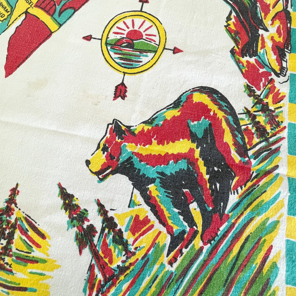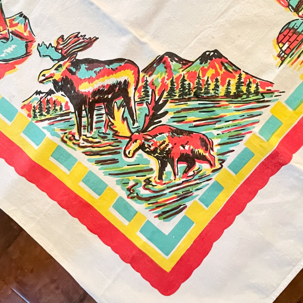 Vintage Alaska souvenir tablecloth with map including cities and interesting tourist sights.