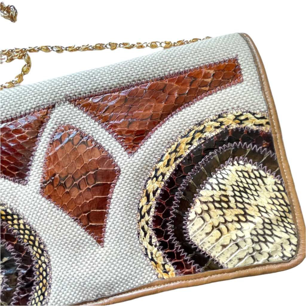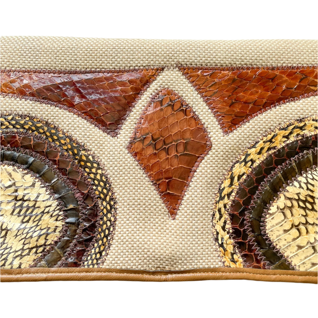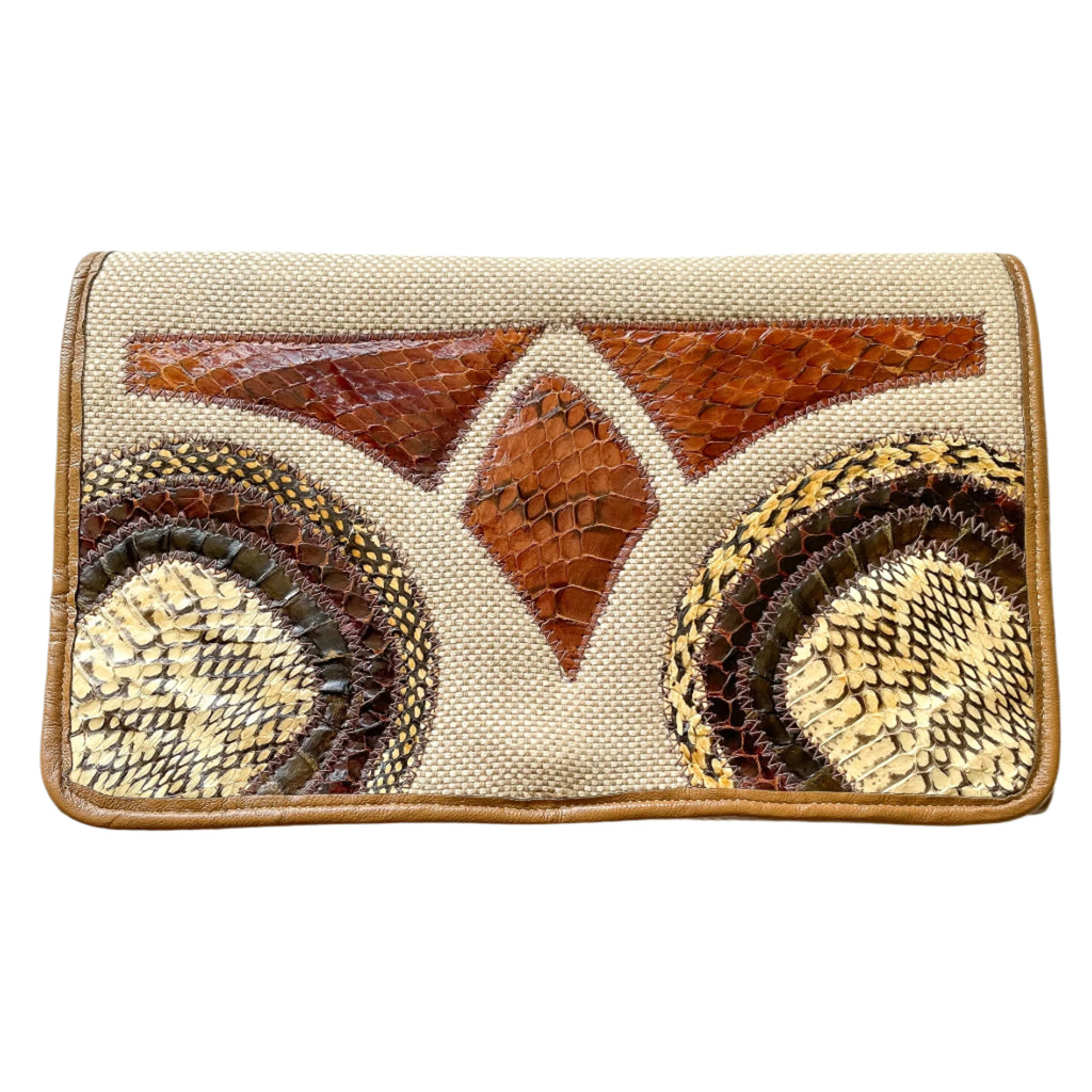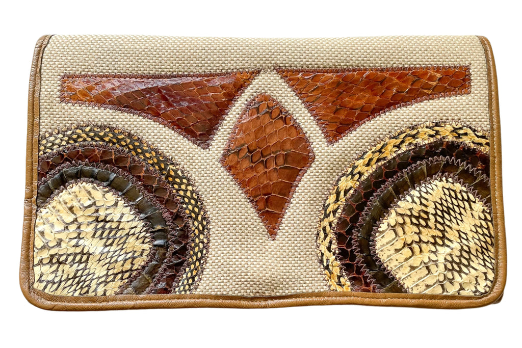 Vintage cloth clutch handbag with applique snakeskin on the front.
