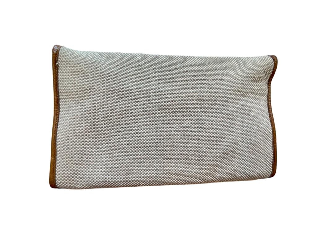 Edged in leather, lined in vinyl, thin metal shoulder strap.
