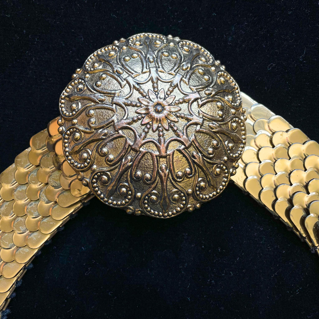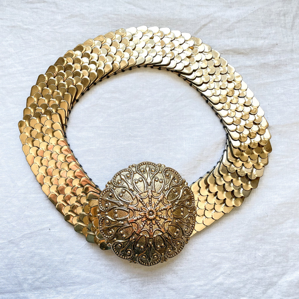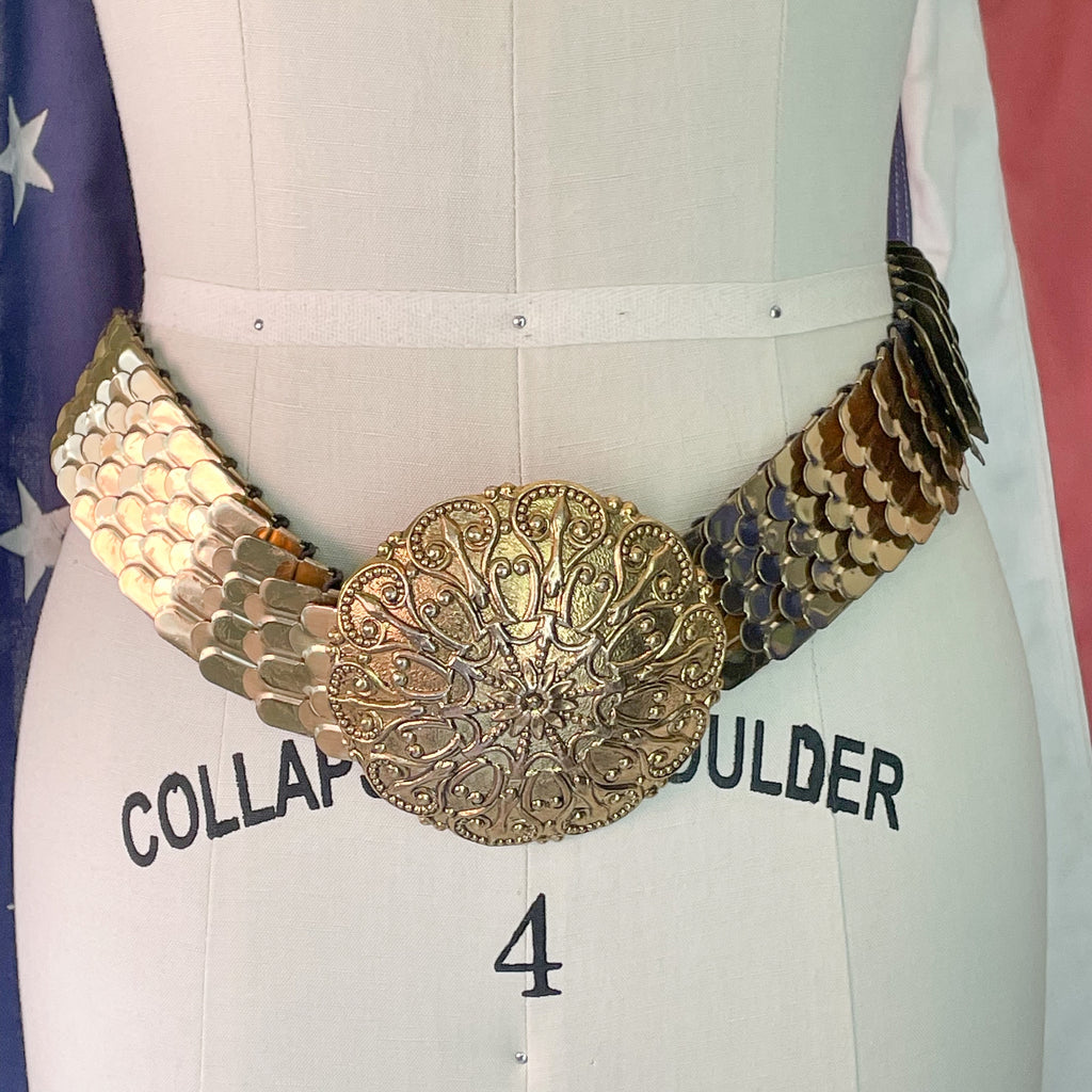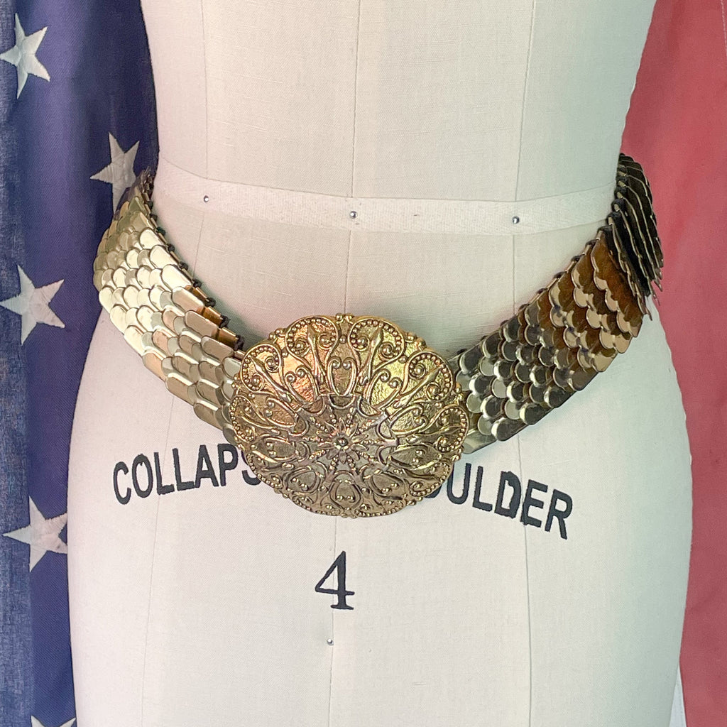 Vintage 60s fish scale style gold tone belt with 4" large decorative belt buckle.