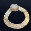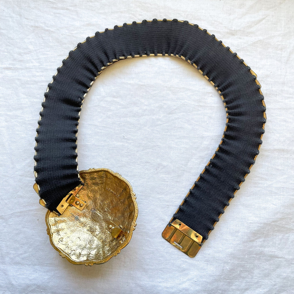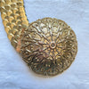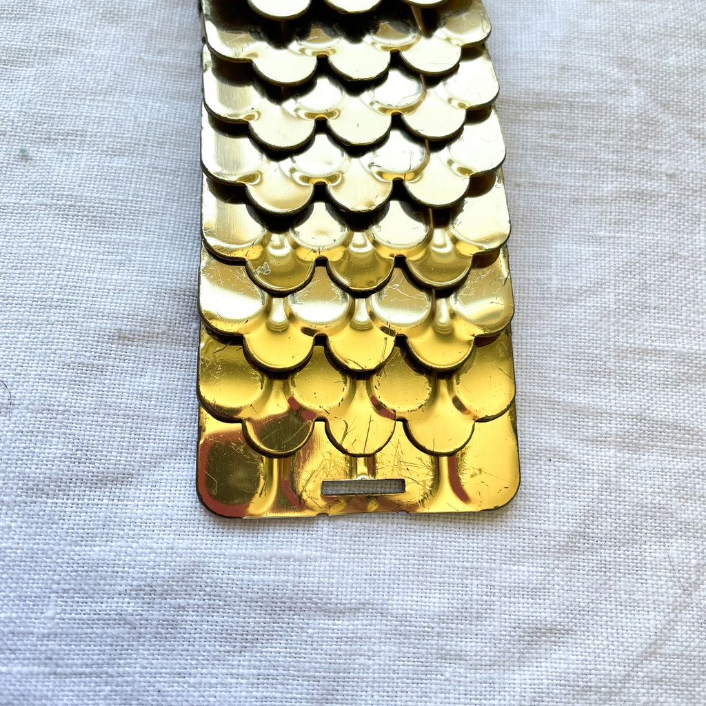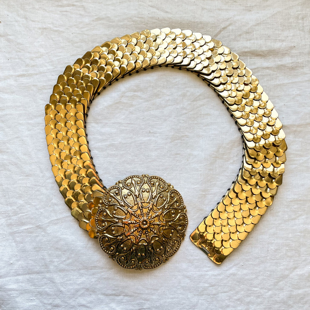 Vintage 60s fish scale style gold tone belt with 4" large decorative belt buckle.