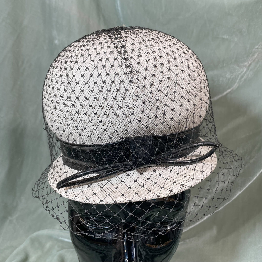 Vintage 60s MOD structured straw helmet hat with black net and vinyl banding & bow.