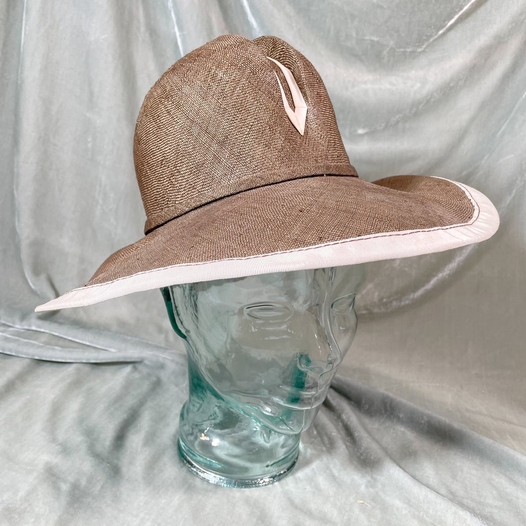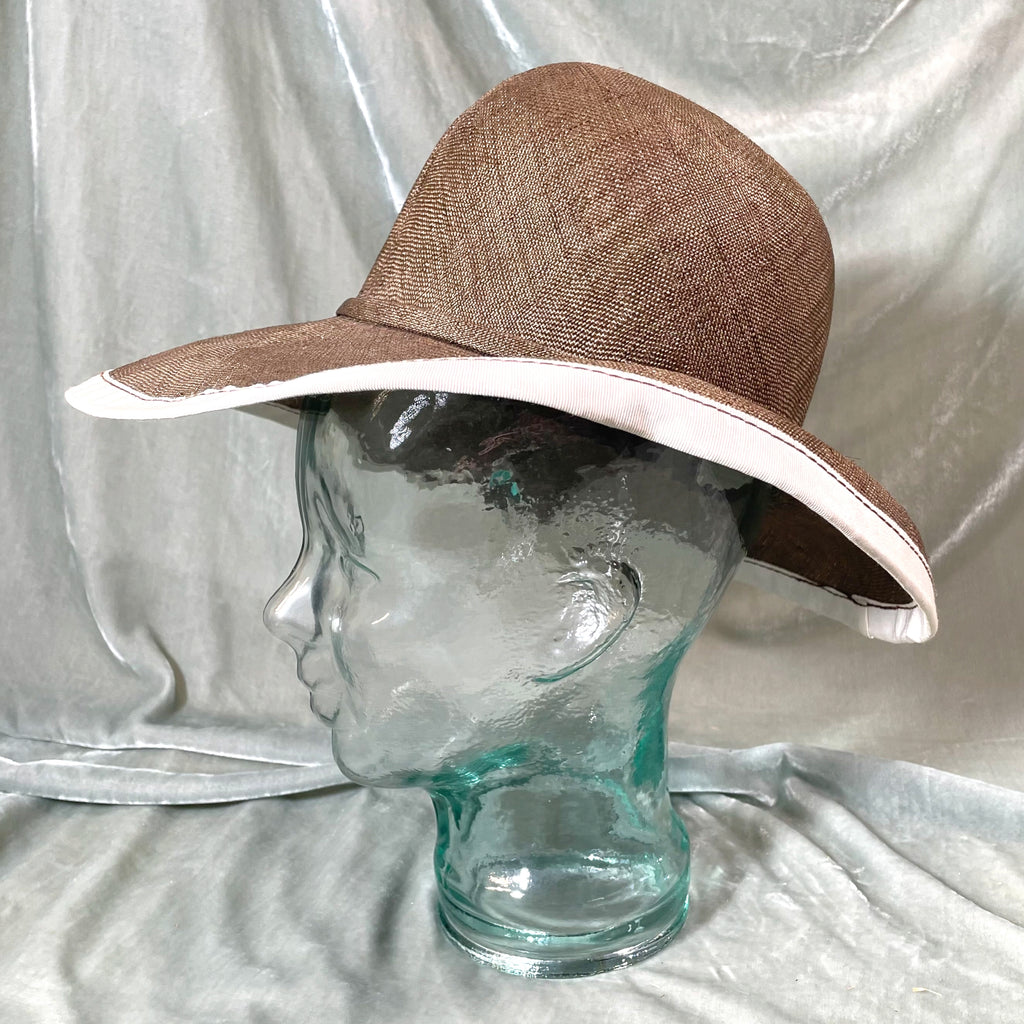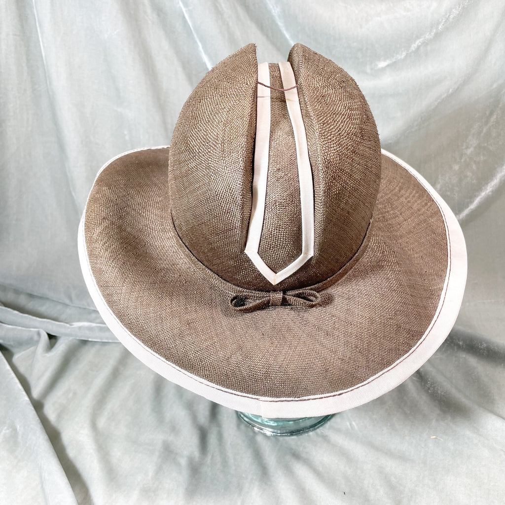 Vintage straw hat with ribbon banding on the brim and center.