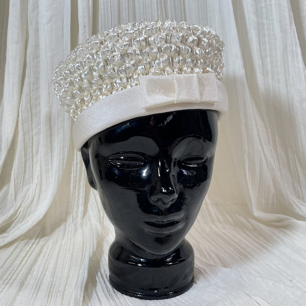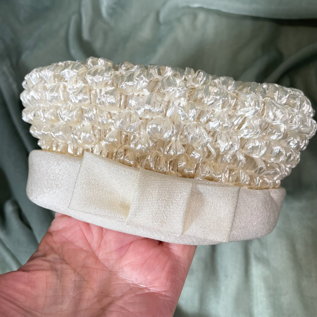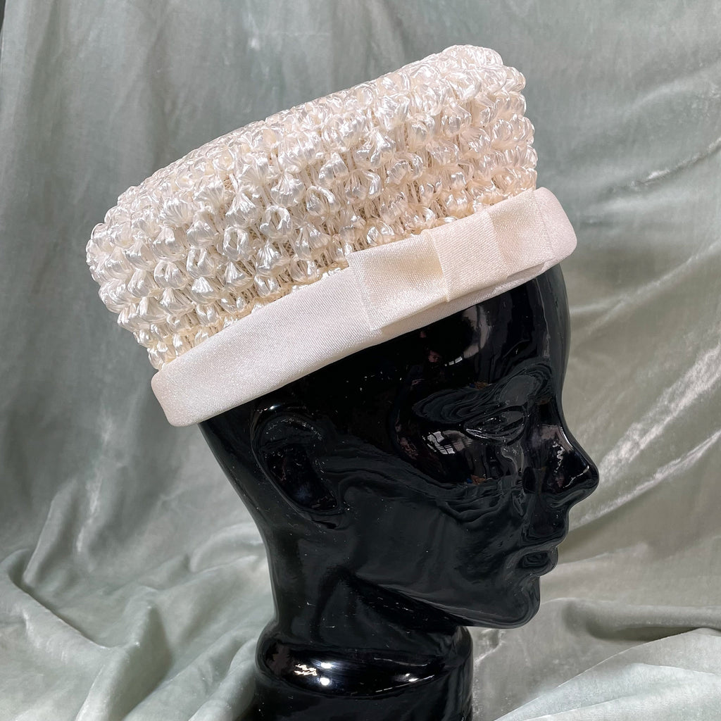 Vintage 60s woven raffia/straw pillbox hat with ribbon banding and accent bow.