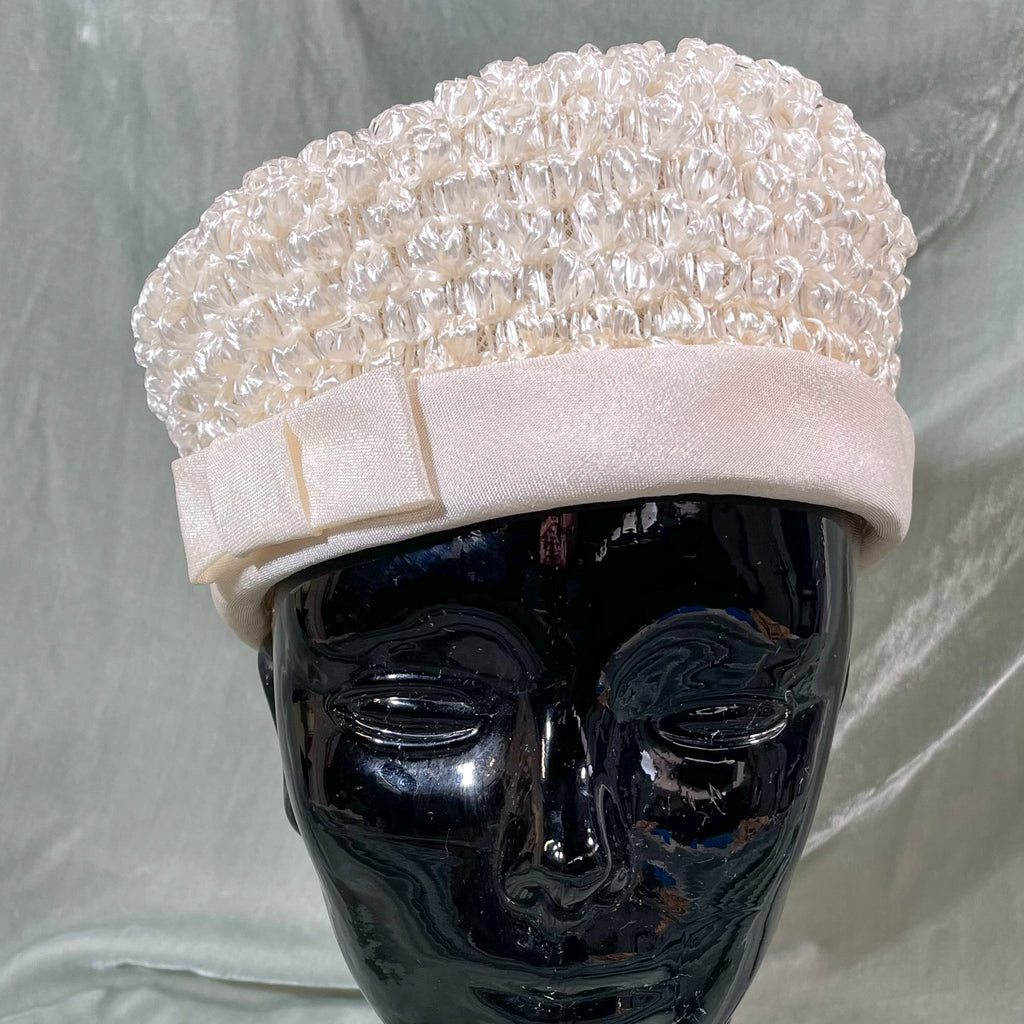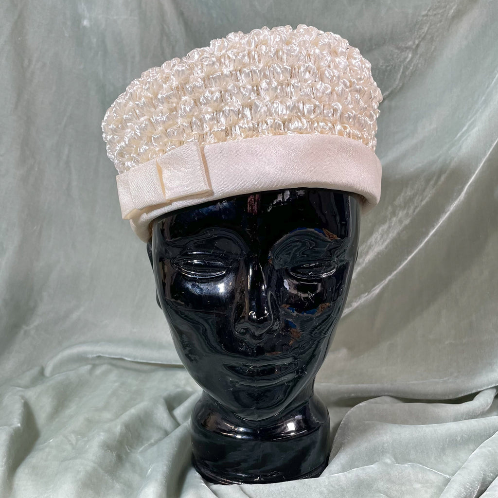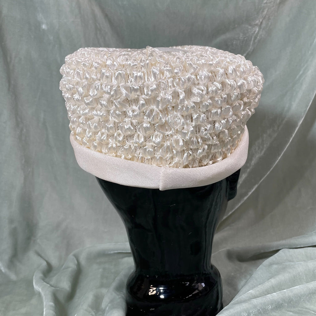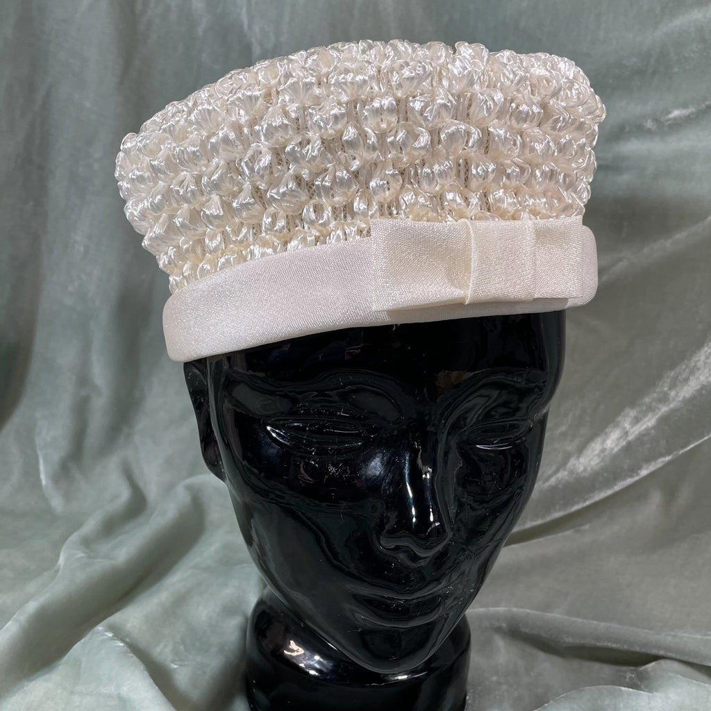 Vintage 60s woven raffia/straw pillbox hat with ribbon banding and accent bow.