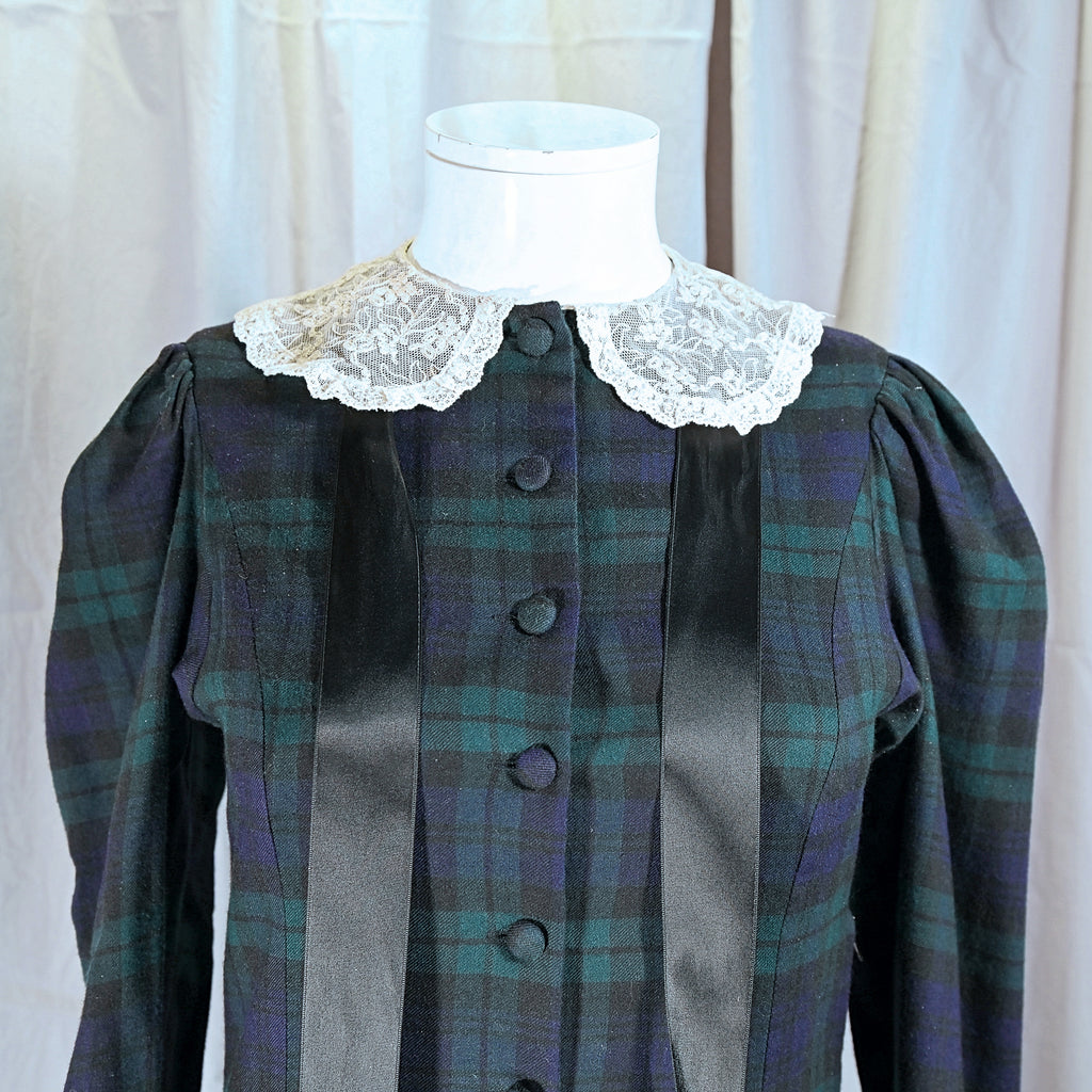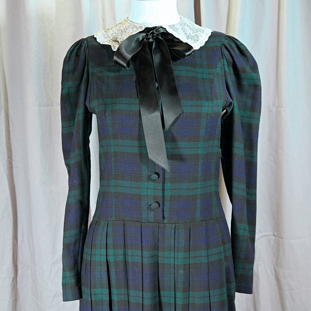 Lovely Tartan plaid Laura Ashley dress with puff sleeves, lace collar, ribbon tie at neckline.