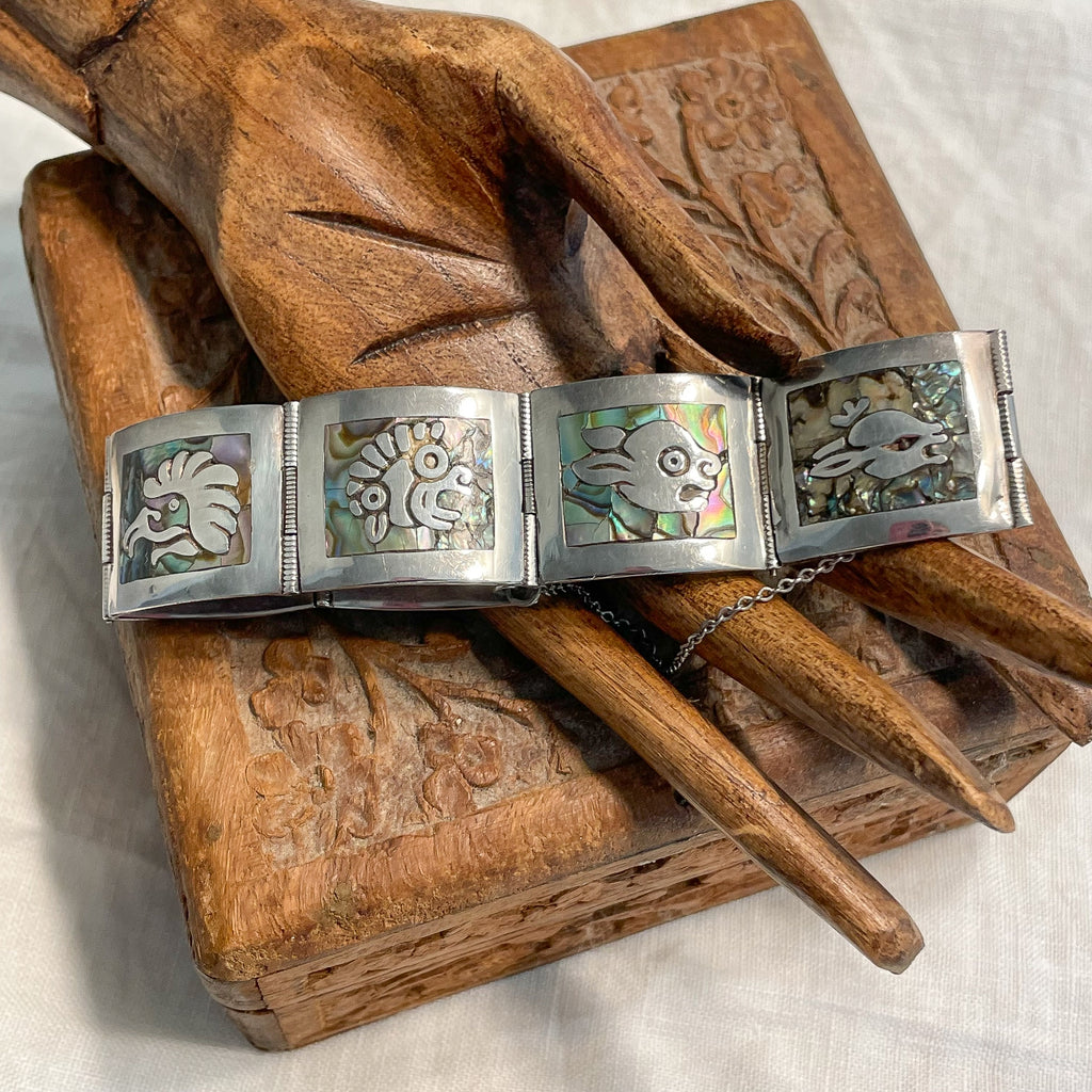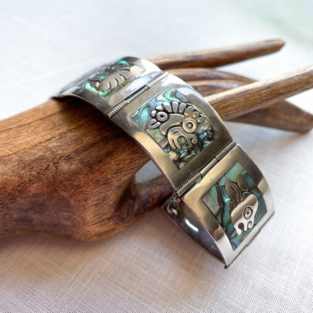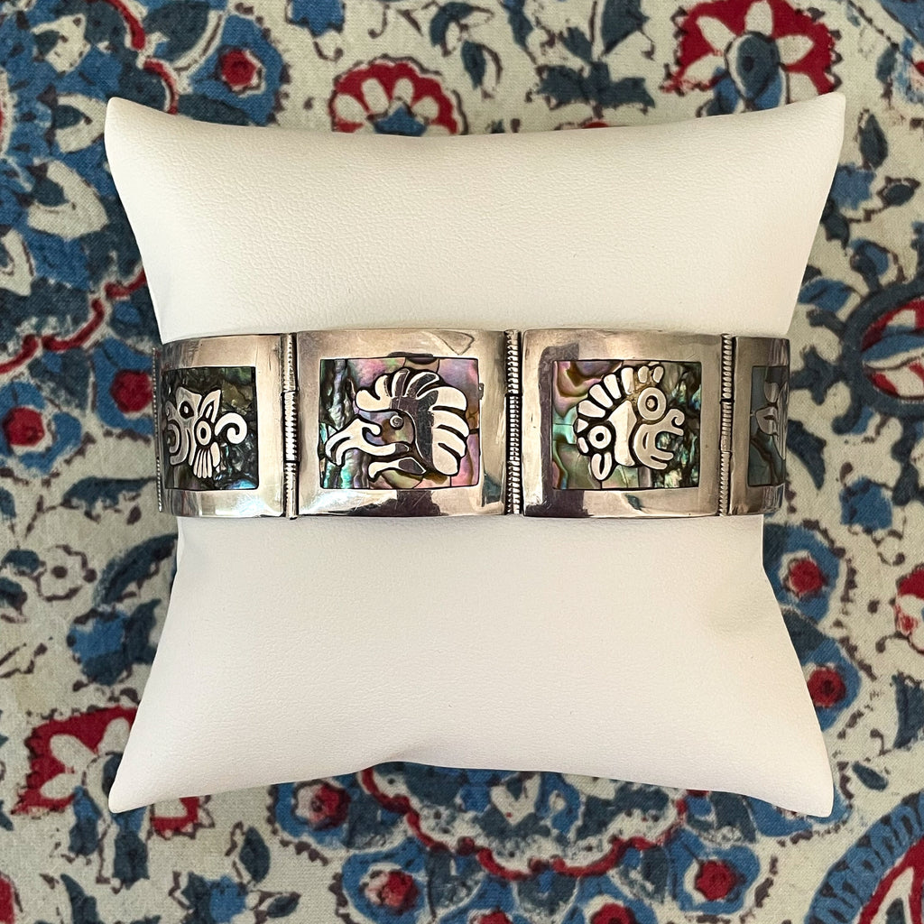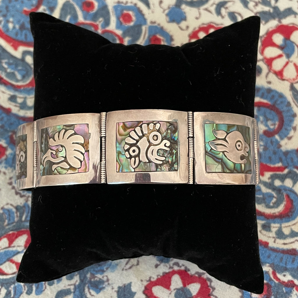 Vintage Gerardo Lopez Taxco Abalone/Sterling Silver Bracelet, Mesoamerican Aztec Animals