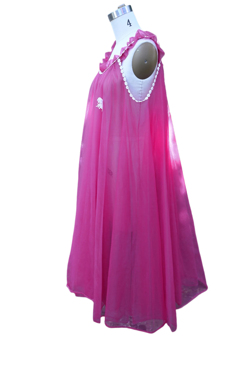 Sleeveless, very full. Tiny scalloped stitch details on the hemline.
