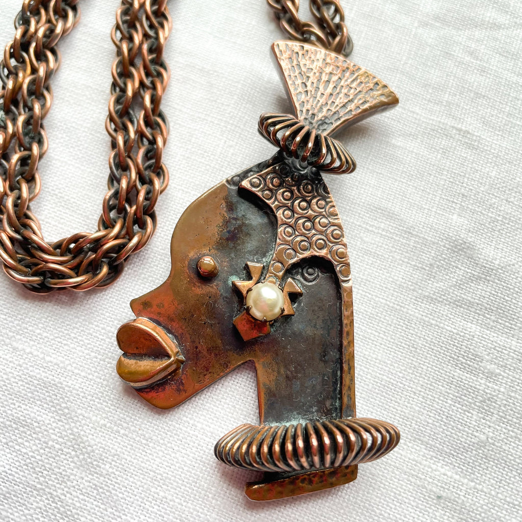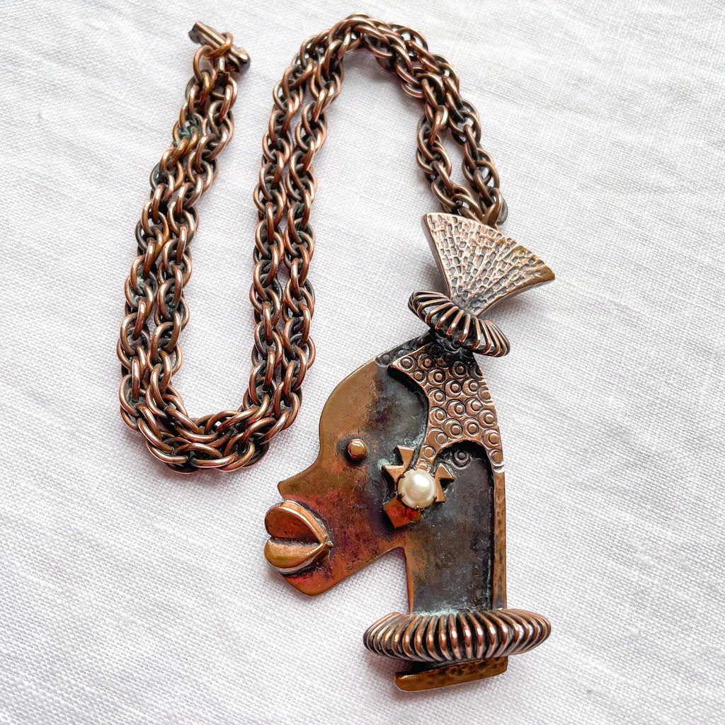 Vintage Rebajes Ubangi Woman Pendant Necklace, Modernist Copper Necklace