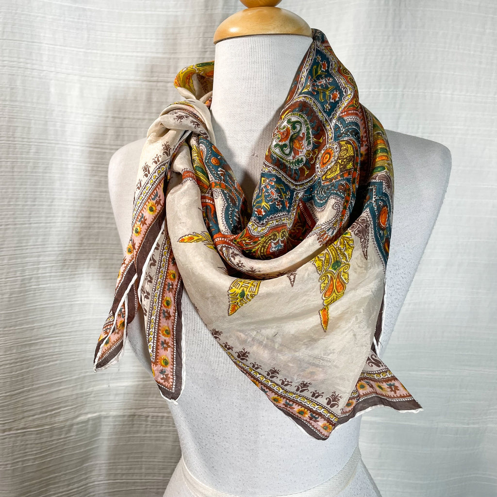 Vintage large silk scarf with paisley medallion in the center and printed border.