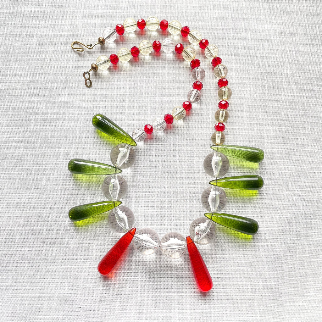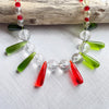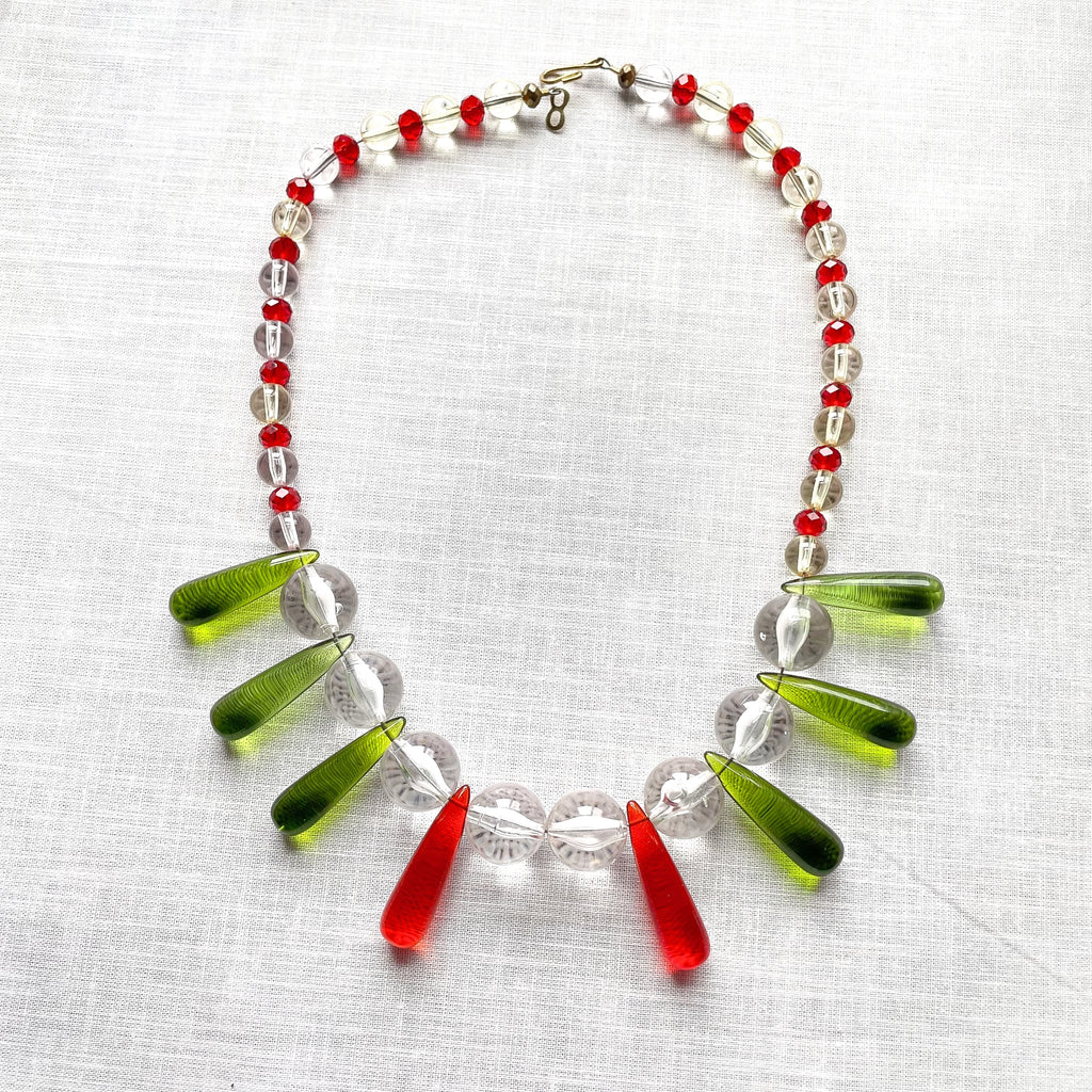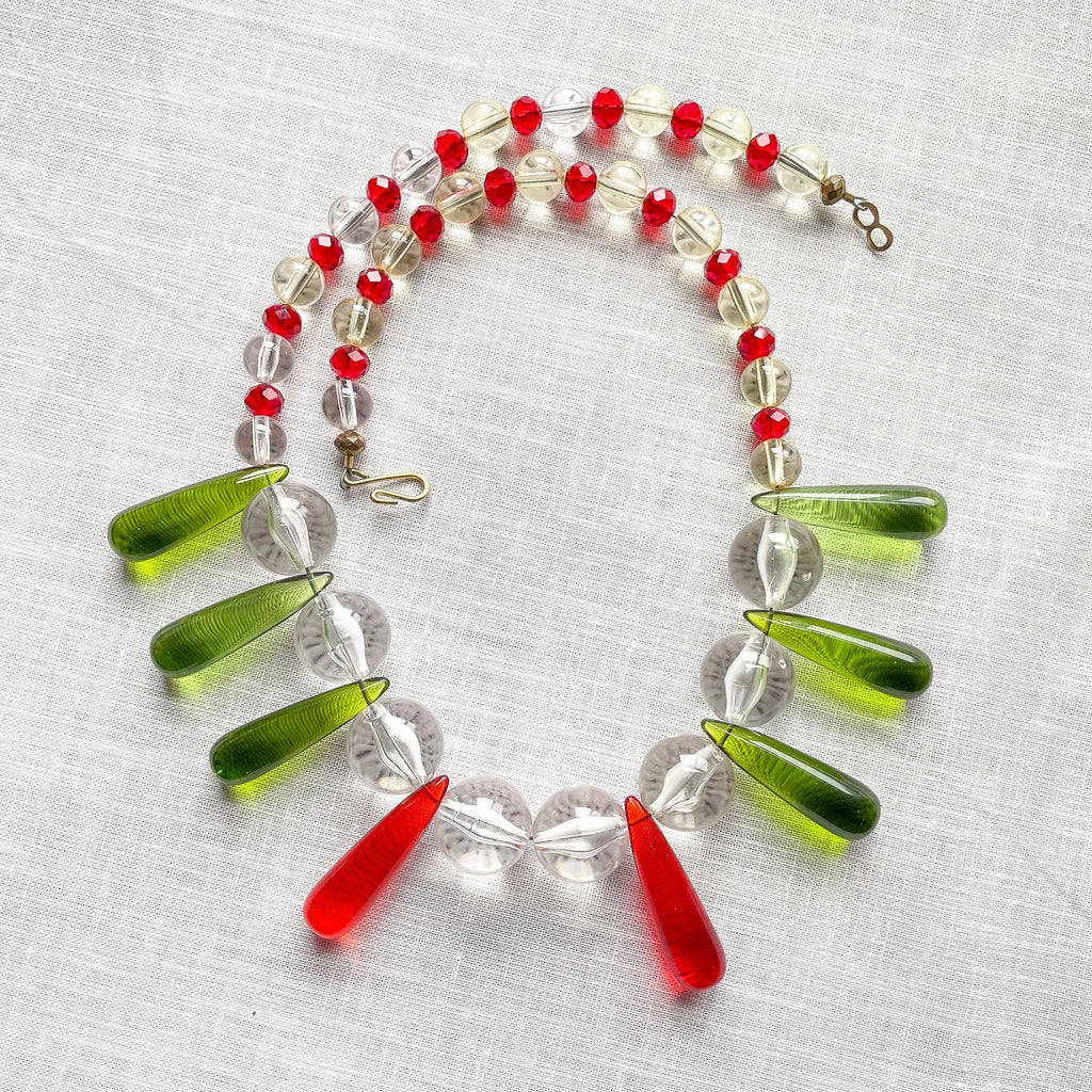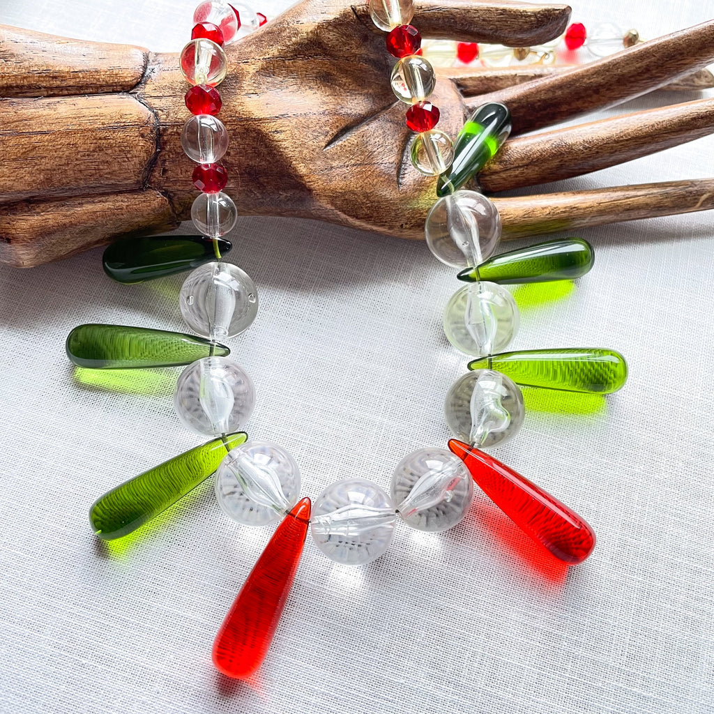 Red and green teardrop glass beads, red crystal beads, and clear Lucite beads.