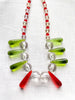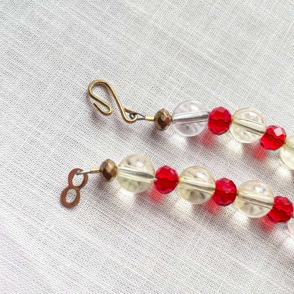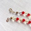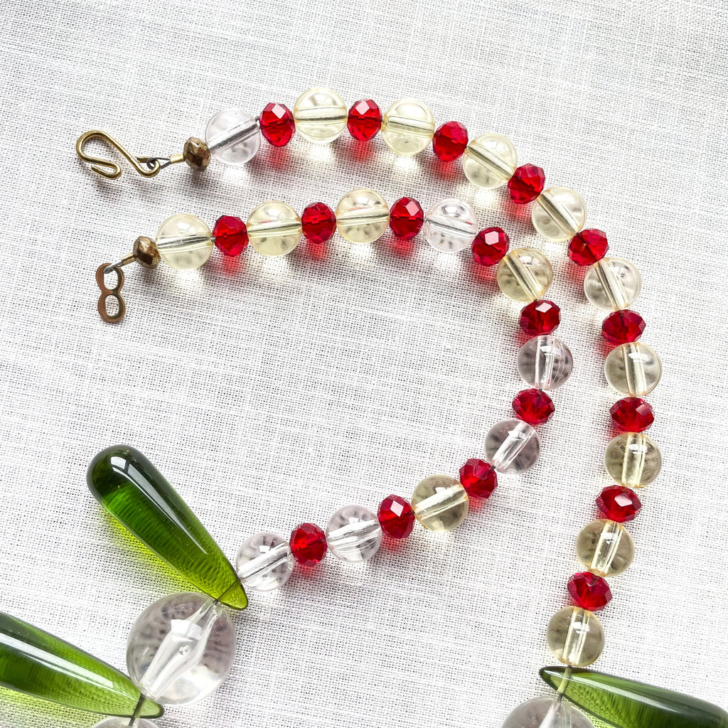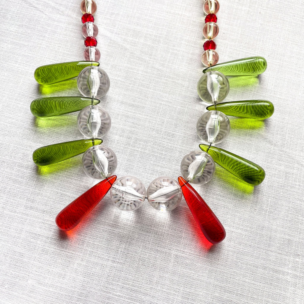 Red and green teardrop glass beads, red crystal beads, and clear Lucite beads.